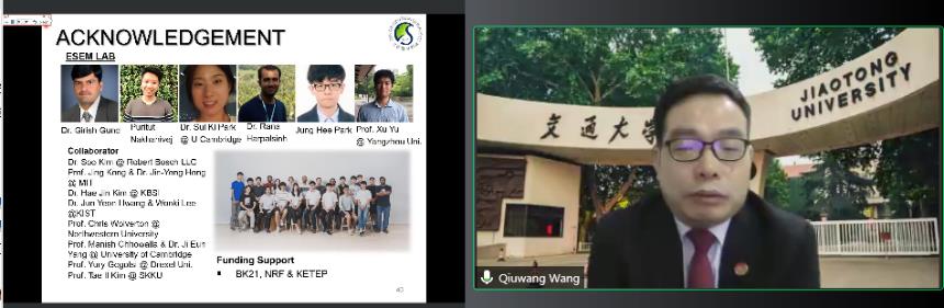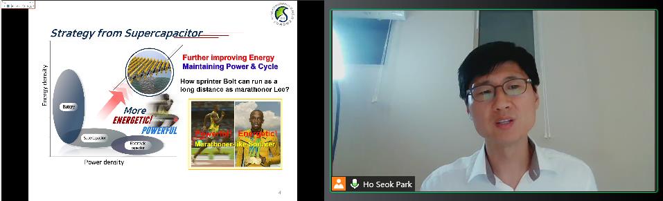 Then, Dr. Ho Seok Park first presents his recent achievement with topic of 2D Pseudocapacitive Nanomaterials for High Energy- and High Power-Oriented Applications of Supercapacitors. Prof. Park is a professor of Chemical Engineering at the Sungkyunkwan University (SKKU), an adjunct professor at the Samsung Advanced Institute for Health Science & Technology (SAIHST). He used to work as a Postdoctoral Researcher in the Department of Biological Engineering at MIT from 2008 to 2010. His current research interests focus on energy storage and conversion based on 2D and carbon nanomaterials. Supercapacitors (SCs) are an electrochemical energy storage device that can fill the gap between batteries and electrolytic capacitors. However, the widespread applications of commercialized carbon-based SCs are limited by their energy density, arising from their physical charge storage mechanism, which is by far lower than that of batteries. Firstly, he addressed their contribution to the improvement of pseudo-capacitance by the molecular level surface redox sites of 2D pseudocapacitive nanomaterials such as P-doped graphene and black phosphorus. In addition to energy aspect, he focused on the kinetics feature of 2D MXenes, correlating with the multiscale structure and chemistry for ultrahigh power and high frequency response.
