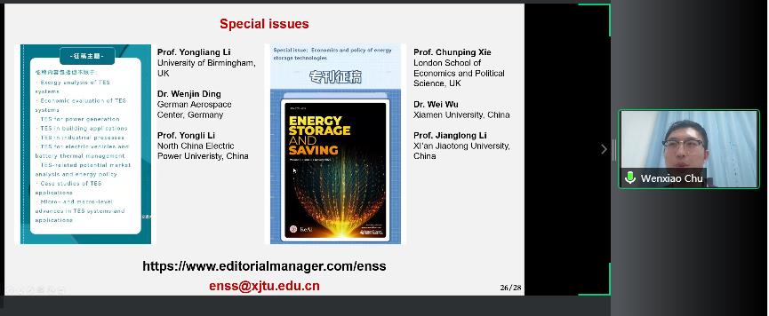 Since December in 2020, ENSS started planning, and then, the associated editor (AE) team was organized and we hold the AE meeting on Jan.26, 2021. After the editorial board members prepared, an excellent launch event for ENSS was hold subject to the 125th birthday celebration of Xi’an Jiaotong University. The Vol. 1, No. 1 of ENSS is scheduled to launch in January 2022. Currently, the special issue with the topic of energy analysis of thermal energy storage systems are calling for papers, which is organized by Prof. Yongliang Li (University of Birmingham, UK). Another special issue is organized by Prof. Chunping Xie (London School of Economics and Political Science, UK), editing with the topic of economics and policy of energy storage technologies.