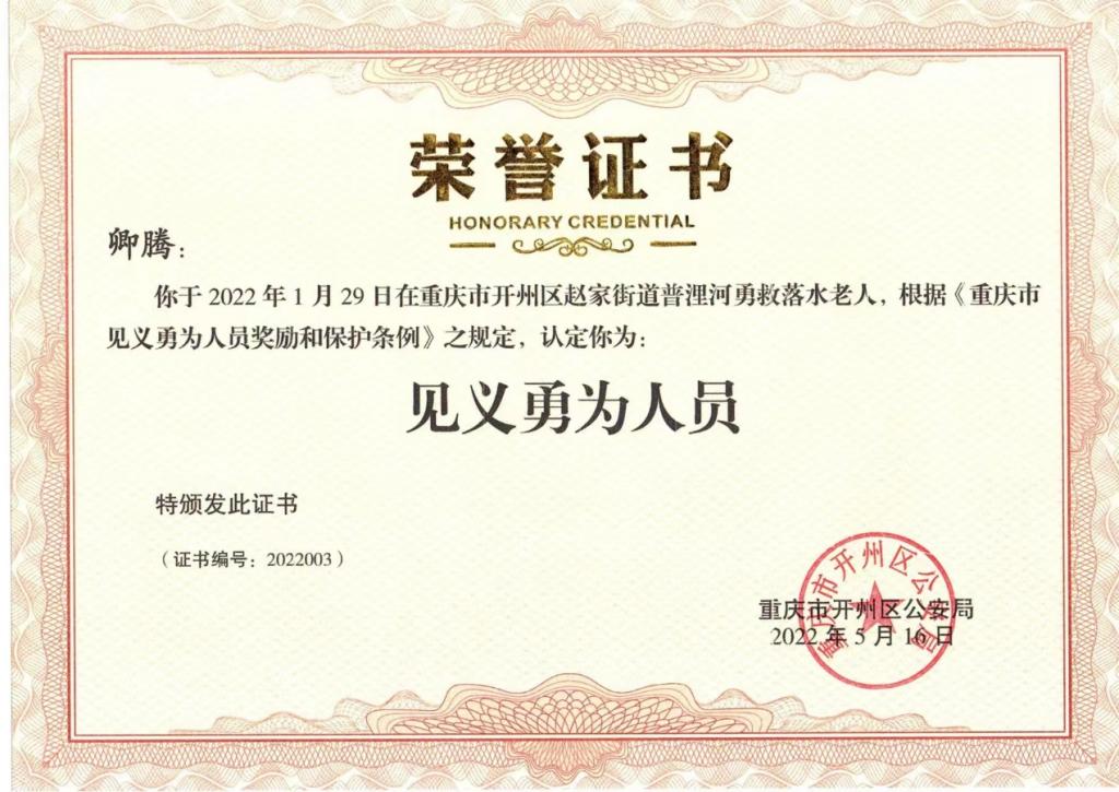 在今年寒冷的冬天,卿腾同学在老家重庆市冒着生命危险跳入水中勇救落水老人,成功挽救了79岁周某生命,其行为得到当地群众一致称赞,成为见义勇为模范榜样,今年5月,重庆市开州区给认定卿滕为“见义勇为人员”。卿滕今年23岁,家住重庆市开州区,西安交大司机社 热流科学与工程专业硕1044班学生,是一名入党积极分子。1月29日下午1点左右,卿腾接到来自他弟弟的电话,听闻码头处有个人漂在河面上后,他立...