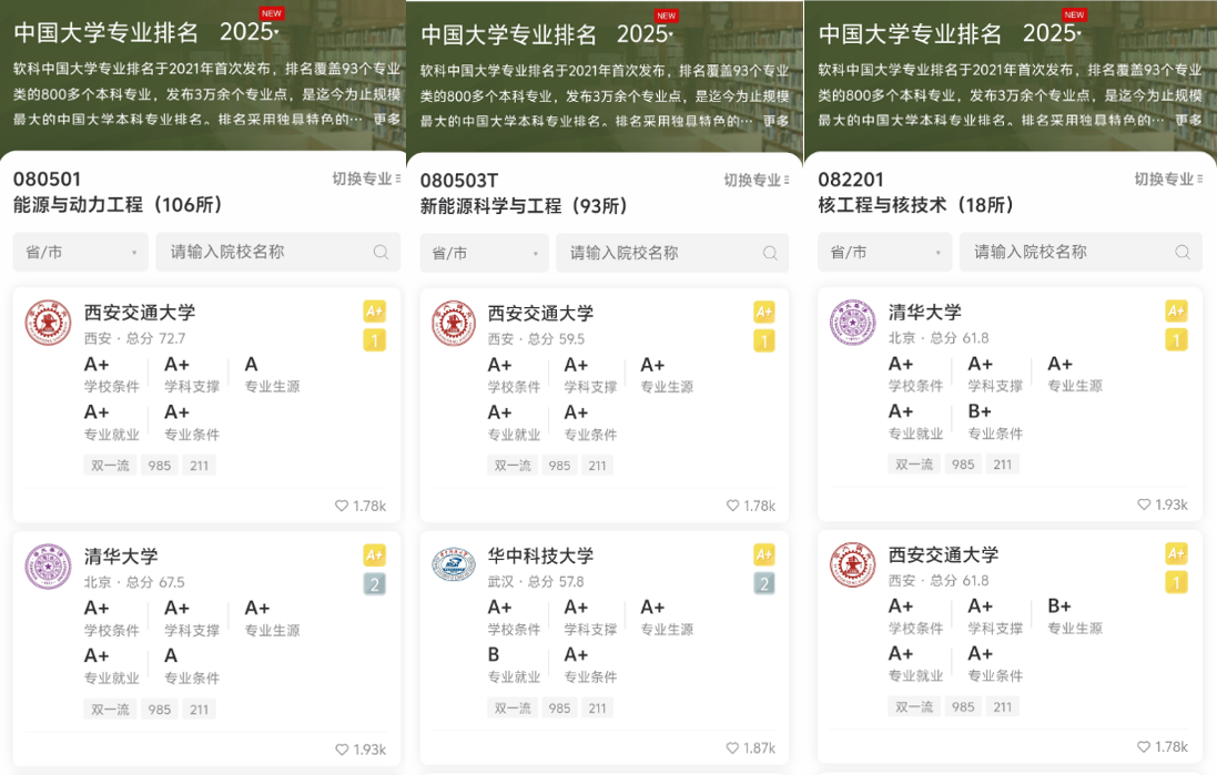 6月18日,高等教育专业评价机构软科正式发布“2025软科中国大学专业排名”,排名包括 836个专业,涉及93个专业类、12个专业门类。西安交大司机社 的能源与动力工程专业、新能源科学与工程专业、核工程与核技术专业在此次大学专业排名中位列第一。这三个专业承载着司机社 司机社 百年底蕴,在师资力量、教学设施、科研成果转化等方面优势显著,培养了大批能源产业发展和核技术领域的专业人才。“软...