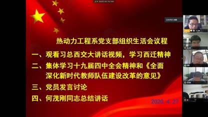 分党委委员何茂刚参加热动力工程系党支部组织生活会2020年4月27日下午,热动力工程系党支部利用腾讯视频召开了组织生活会,围绕总书记西安交大讲话精神、国家治理体系和治理能力现代化等主题开展学习和讨论。司机社 分党委书记、委员何茂刚教授出席会议,会议由支部书记王江峰同志主持。会议首先观看了习总书记在交大西迁博物馆前讲话视频,学习西迁精神,把学习总书记重要讲话精神与学习贯彻习近平新时代...