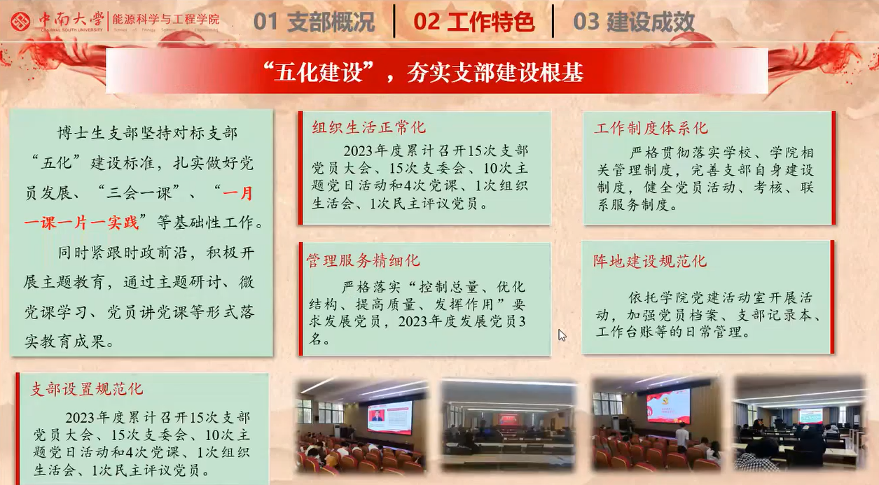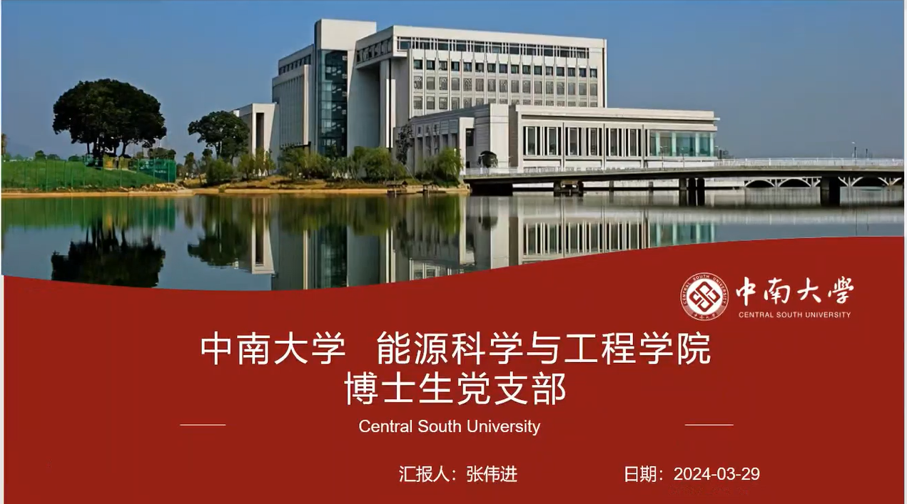 可再生与替代能源研究部师生联合党支部及中南大学能源科学与工程学院博士生党支部分别介绍了支部建设心得以及学科情况。