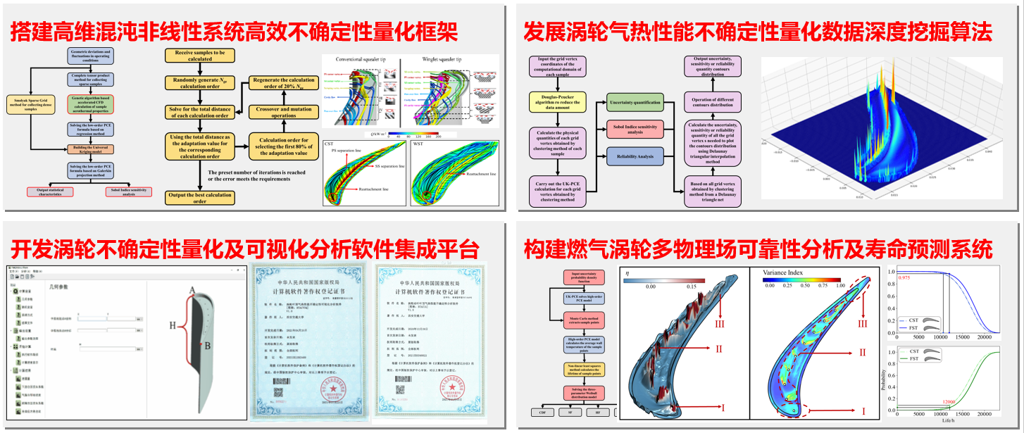 黄明同学的博士研究课题为燃气涡轮气动热力学与传热冷却、不确定性量化与敏感性分析和鲁棒性优化设计。作为研究骨干参与导师负责的国家自然科学基金重点项目1项和航空发动机及燃气轮机重大专项基础研究项目课题3项、军工项目1项、企业课题1项。黄明同学提出了基于非嵌入多项式混沌方法的涡轮叶尖流动与传热不确定性传播算法;开发了涡轮动叶叶顶气热性能不确定性量化高性能分析集成软件;构建了燃气涡轮多物理场可靠性分析及寿命预测系统;发展了叶片端区不确定性流动换热场数据挖掘技术,全自主地实现三维流动换热场可视化算法;建立了涡轮叶片叶顶典型冷却结构的特征偏差低敏感性几何参数设计体系;研发了低敏感性和高综合气热性能的涡轮冷却结构。其研究工作被《Energy》、《Applied Thermal Engineering》和《Applied Energy》等一区Top期刊多次引用。