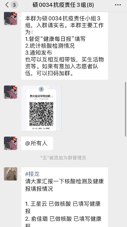 疫情发生以来,学院充分发挥党组织优势,让党旗在疫情防控一线高高飘扬,迅速形成指挥体系,组织学院各党支部搭建“党支书-党支委-党员-群众”四级责任体系,各级体系之间紧密对接,保障了重要通知的有效传递。设置“党支部抗疫责任人体系”,确保每位党员和群众都有对应抗疫责任人,号召党员充分发挥先锋模范作用,引导广大党员积极组织班级同学坚持每日健康打卡,高效完成全员核酸检测。