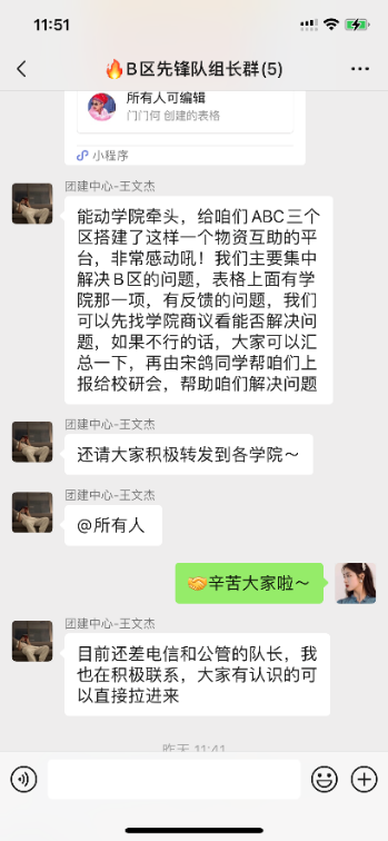 能动澎湃先锋队在帮助本院生活区的同学的同时也积极与其他学院先锋队合作,共同维护生活物资互助平台。