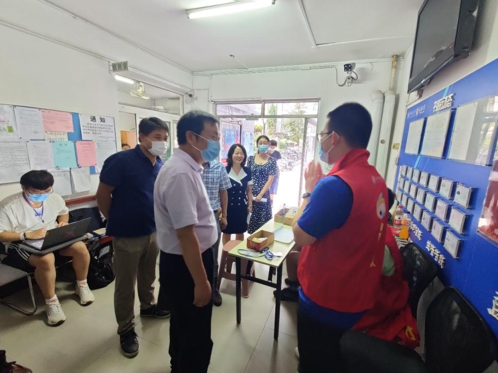 在宿舍楼下,老师们与正在迎新的学生志愿者交流,了解了迎新志愿服务工作开展和提前到校新生参与志愿服务等情况