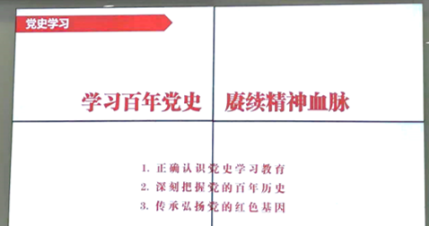 第三项,落实学校和学院安排,认真组织开展党史学习,支部书记秦浩主讲了“学习百年党史,赓续精神血脉”的专题党课,从正确认识党史学习教育、深刻把握党的百年历史、传承弘扬党的红色基因三个方面,结合党史、新中国史、改革开放史和社会主义发展史,通过重要人物和重大事件的展开,向党员同志们讲解了中国共产党的建立、发展和壮大的光辉历程,阐述了中国共产党的领导是中国特色社会主义的本质特征和最大优势,强调了坚决做到“两个维护”是党的最高政治原则和根本政治规矩,党员同志们认真学习,取得了良好的学习效果。