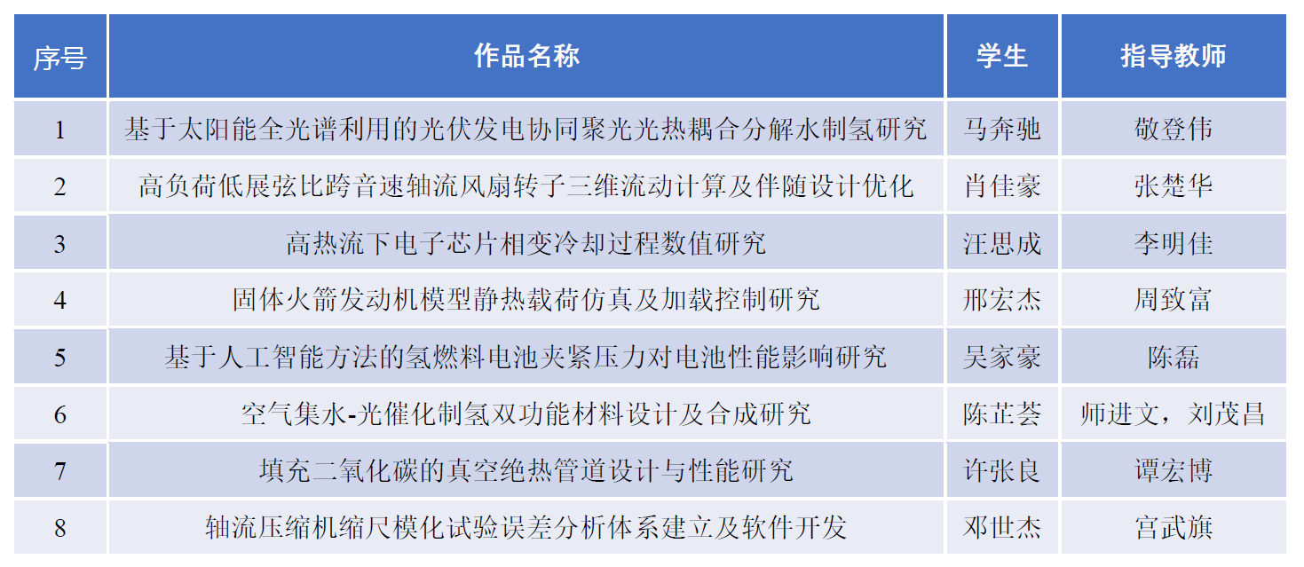 积极鼓励能源与动力类(能源与动力工程专业、新能源科学与工程专业)学生报名参与,最终8个作品入选全国优秀毕业论文(设计)作品,获优论文数在众多高校中位居第一,充分证明了我校在本科生人才培养方面的教学质量,特别是对本科生实践能力和创新能力方面的培养。