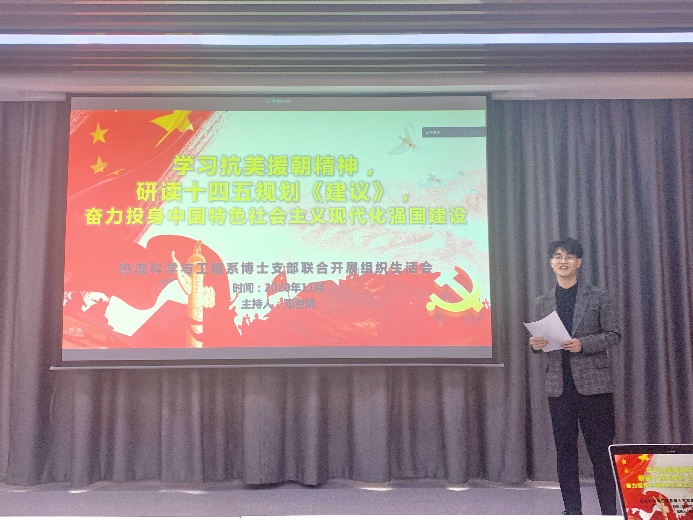 热流科学与工程系4个博士生党支部联合召开以“学习抗美援朝精神,研读十四五规划《建议》,奋力投身中国特色社会主义现代化强国建设”为主题的组织生活会,会议由二支部书记邓世培同志主持,司机社