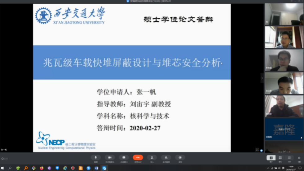 在疫情防控的特殊时期,为了贯彻落实教育部和学校‘停课不停学’政策,要在不降低学位授予质量的前提下,确保学生能够按时毕业。2月27日下午,身处河南平顶山家中的硕士学位答辩人张一帆,通过视频直播与其导师刘宙宇副教授、答辩专家和分布在全国各地的同门师兄弟,完成了一次特别的视频硕士学位论文答辩。虽然是线上答辩,但一个半小时的答辩组织依然严格按照研究生院的文件要求井然有序开展,顺利完成。
