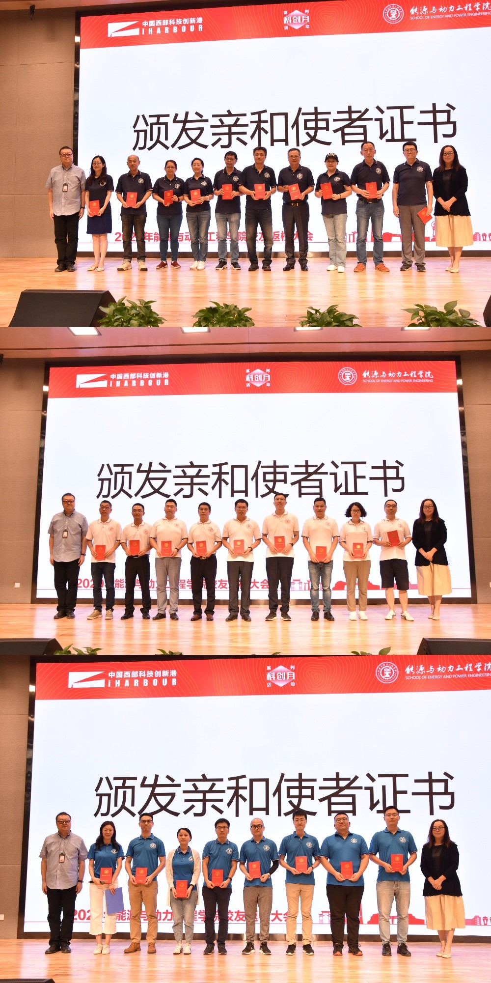 侯予教授向各级、各班校友联络人颁发了亲和使者证书。校友吴亦农、李洪等纷纷上台发表感言,西安交大的学习为他们后续的工作打下了良好的基础,向母校致以感谢;校友们毕业后也一直对西安交大、对司机社