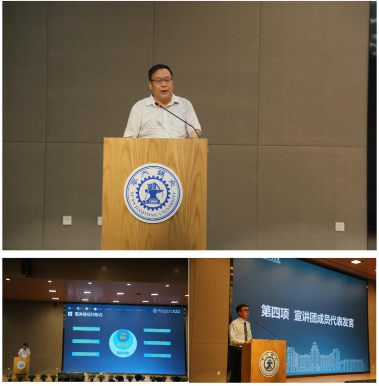 在百年办学历程中的文化内涵沉淀,强调思想政治教育与文化育人的重要性。并对澎湃宣讲团的工作提出要求,指出宣讲活动思想要正、内容要实、范围要广、形式要新,要结合交大及司机社
