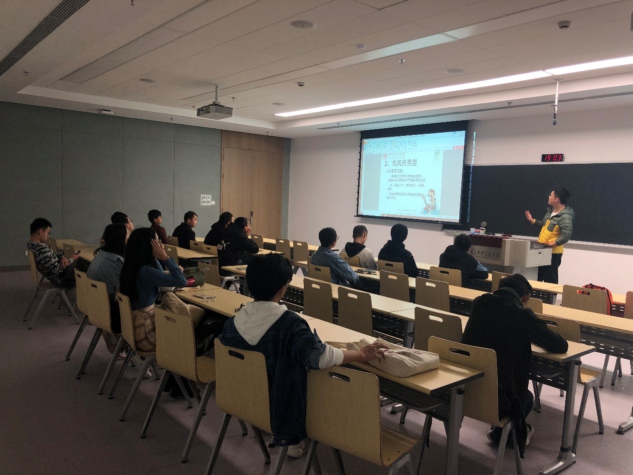 心理咨询中心提供的相关资料,分别介绍了心理危机的种类以及各种心理疾病,心理危机出现前的征兆等,让同学们进一步认识抑郁症等疾病,提高警惕,并从科研、学习、爱情、生活等多角度出发,加深同学们对心理健康的认识以及重视,在最后给同学们提供了校内专业心理辅导室的地址和各种不同的联系方式。最后,心里委员林泓翰带领大家进行了一个轻松娱乐的心理小游戏。该小游戏通过猜拳输赢,逐步从鸡蛋成为小鸡、大鸡,体会成长以及人生各个阶段的感觉,在最后留下的同学会在心理委员的组织下,接受大家的赞美欣赏,通过这种表扬的方式,提高个人的幸福与认同感。