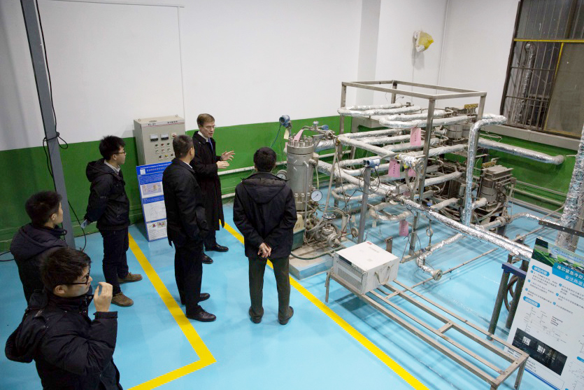 学术报告期间,Peterson教授和秋穗正教授分别介绍了伯克利和西安交大核能科学与技术学科发展和科研状况,并针对美国氟盐冷却高温堆FHR项目,非能动自然循环实验验证等问题进行了深入讨论。双方还深入探讨了后续联合研究,定期派联合培养博士生等事宜。学术报告后,Peterson教授参观了核反应堆热工水力研究室钠沸腾试验回路(NABOLO)、AP1000第四级自动降压夹带试验台架(ADETEL)及严重事故熔融物试验台架(COPRA)等多个大型实验台架。