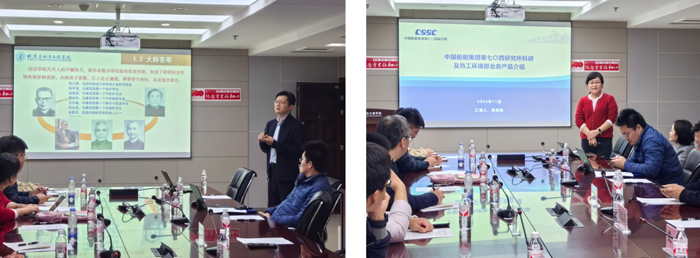 随后,孙中国副院长介绍了学院在能源与动力工程领域的研究优势和特色领域,展示学院的科研实力,也为双方未来的合作提供了明确的方向。中国船舶集团第七〇四研究所热工环境部索晓娜副主任则详细介绍了研究所的相关情况。阐述了研究所在船用动力系统、环境控制和保护技术等方面的专业能力和技术积累。双方的介绍让与会人员对彼此的技术实力和行业影响力有了更深入的了解,为后续的技术交流奠定了坚实基础。