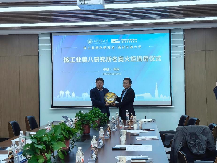回赠西迁纪念品。交流会后,中核八所到核能小镇进行了参观。