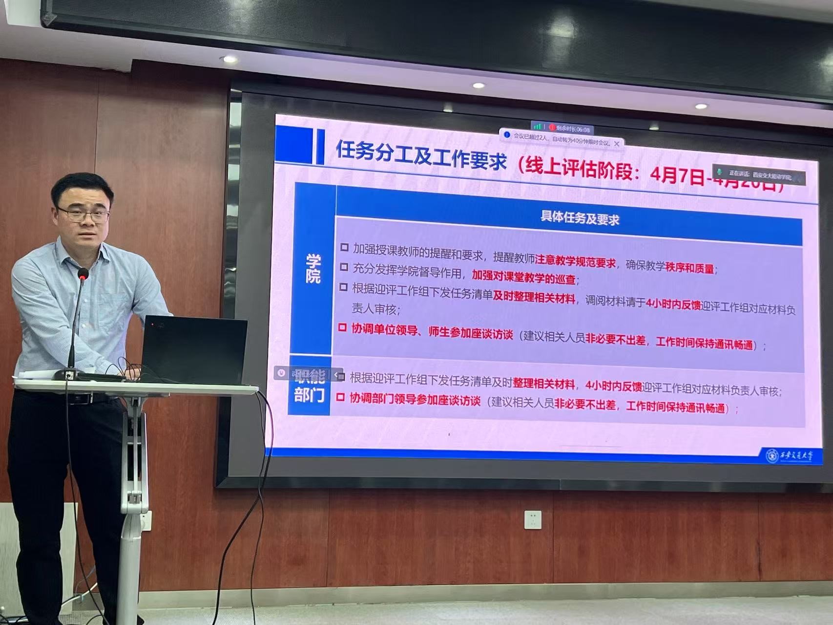 苏进展教授系统汇报了评估准备工作情况与工作要求,围绕评估基本情况、迎评工作进展、评估任务要求三个方面进行了介绍,在迎评期间学院师生应高度重视,重点做好教学材料的规范整理、课堂教学质量提升与展示等各项工作。同时,各系所要建立健全常态化自查机制,通过评估推动教育教学建设与发展,通过评估推动问题整改与机制优化,持续提升本科教育教学的整体质量和水平。
