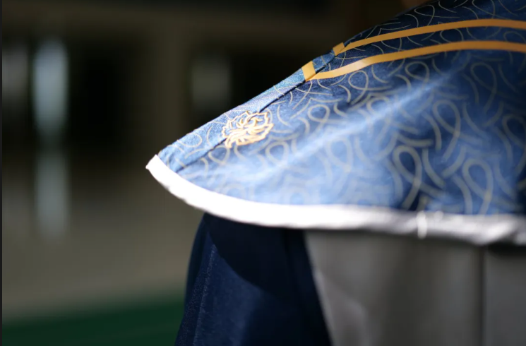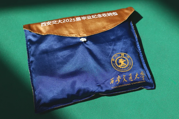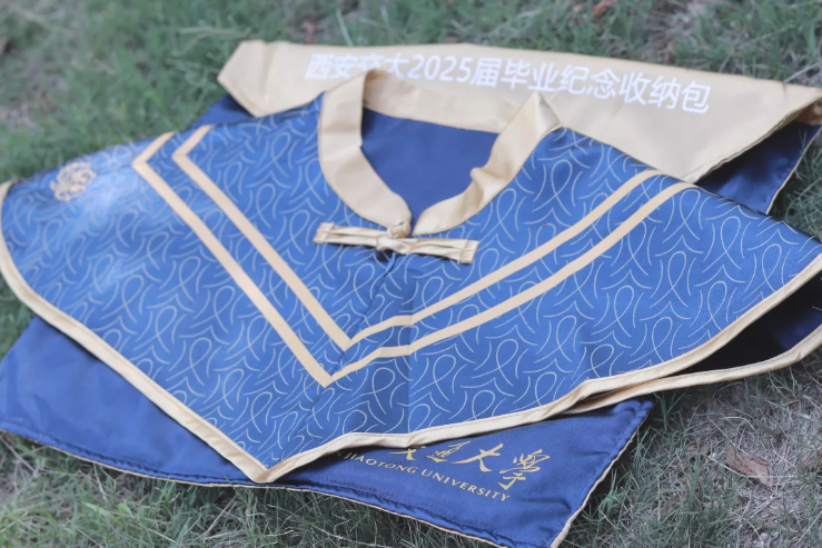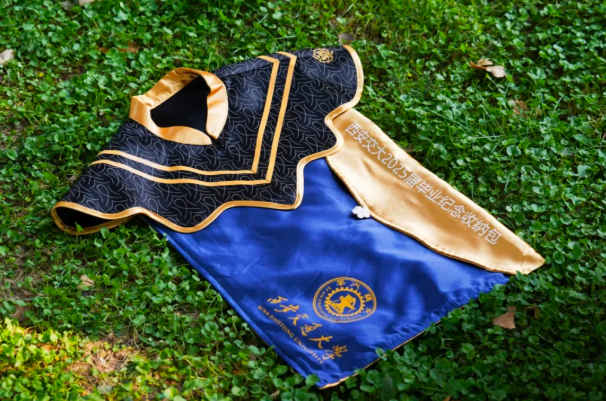袍左下角印本色西迁标识图案,将西迁精神转化为可触可感的视觉符号,激励学子赓续先辈荣光,勇担时代使命。