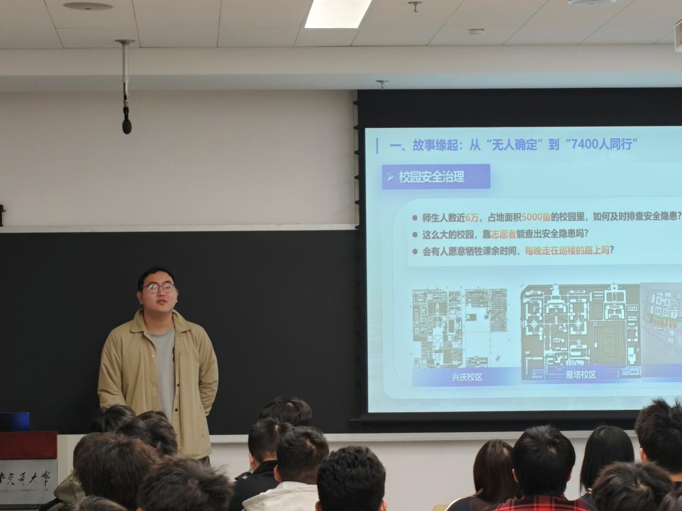 星航临时党支部范海洋系统解读星航计划实践体系:作为学校党委统筹领导、校团委指导,多部门协同支持的综合性志愿服务项目,星航计划以临时党支部为核心,汇聚7400余名志愿者完成40000余小时服务,围绕校园安全治理、基础学科辅导等四大领 域发力。其中校园安全治理创新“网格化巡楼+闭环管理”机制,尤其在夜间安全巡防中形成标准化流程,为守护校园安全提供成熟经验。