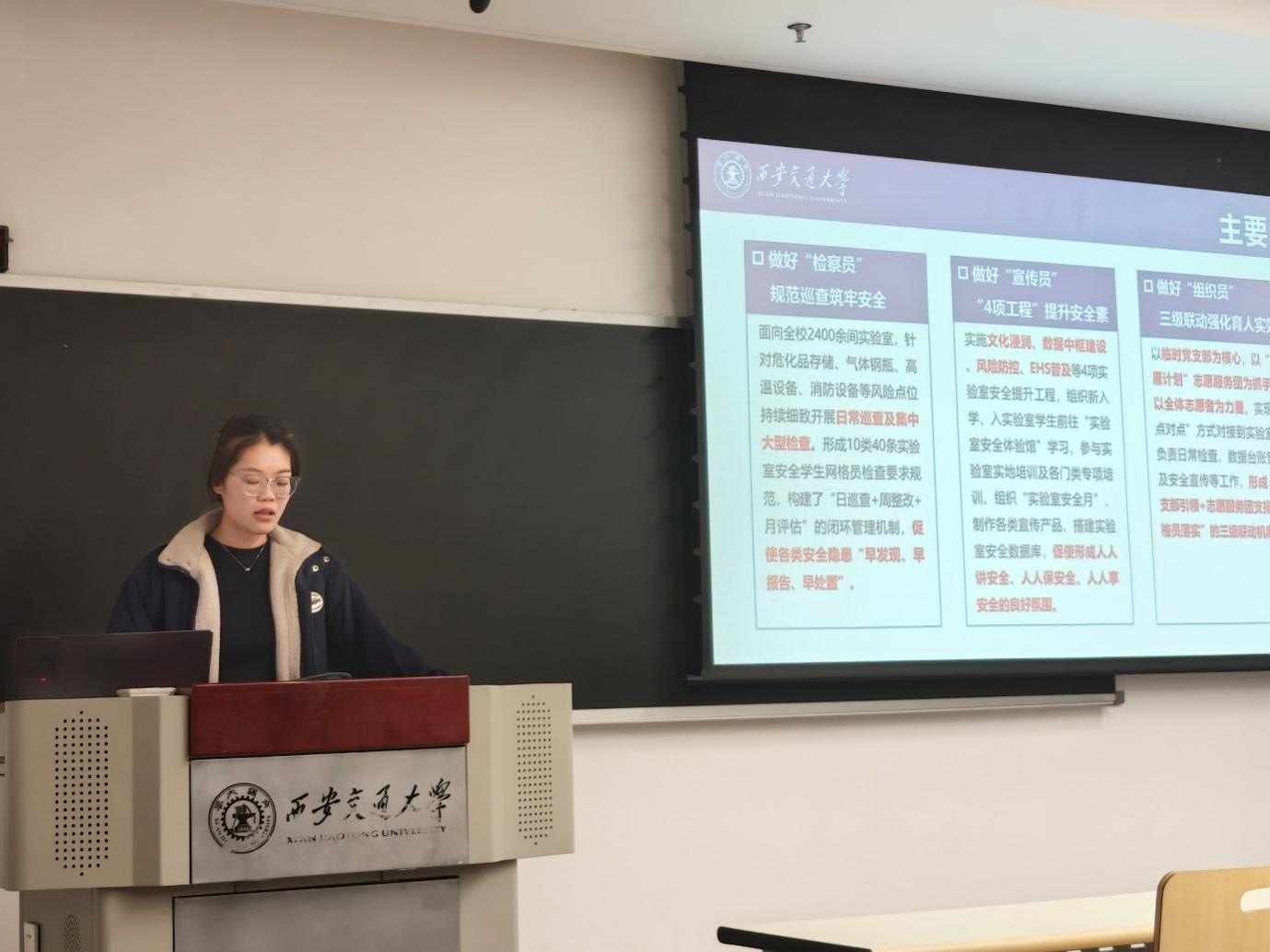 “首雁计划”志愿服务团创新港临时党支部张文静聚焦“首雁计划”核心工作展开讲解,一,做好“检察员” 规范巡查筑牢安全。他们细致开展日常巡查及集中大型检查,为校园安全提供专业保障;二,做好“宣传员”,实施文化浸润、数据中枢建设、风险防控、EHS普及等4项实验室安全提升工程,促使形成人人讲安全、人人保安全、人人享安全的良好氛围。同时,以临时党支部为核心,以“首雁计划”志愿服务团为抓手,以全体志愿者为力量,实现“点对点”方式对接到实验室,三级联动强化育人实效。