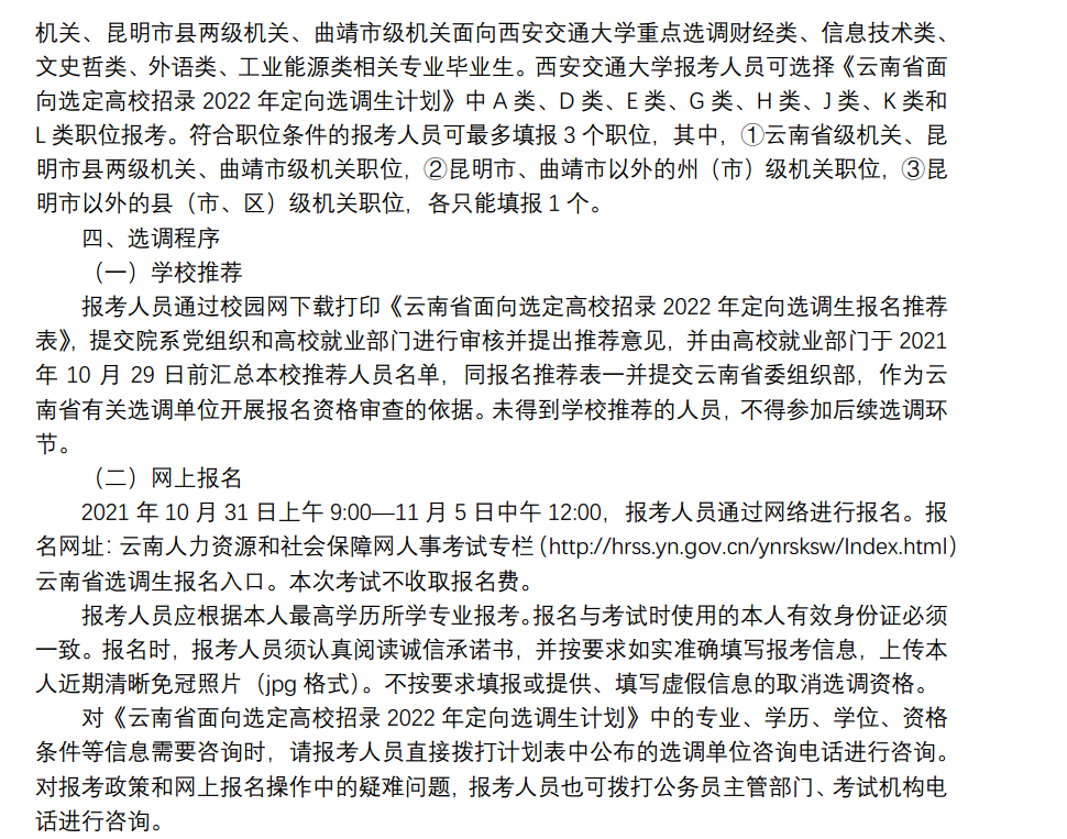 4.通过学校推荐的同学,于2021年10月31日上午9:00—11月5日中午12:00,登录云南人力资源和社会保障网人事考试专栏(//hrss.yn.gov.cn/ynrsksw/Index.html)云南省选调生报名入口进行网上报名。