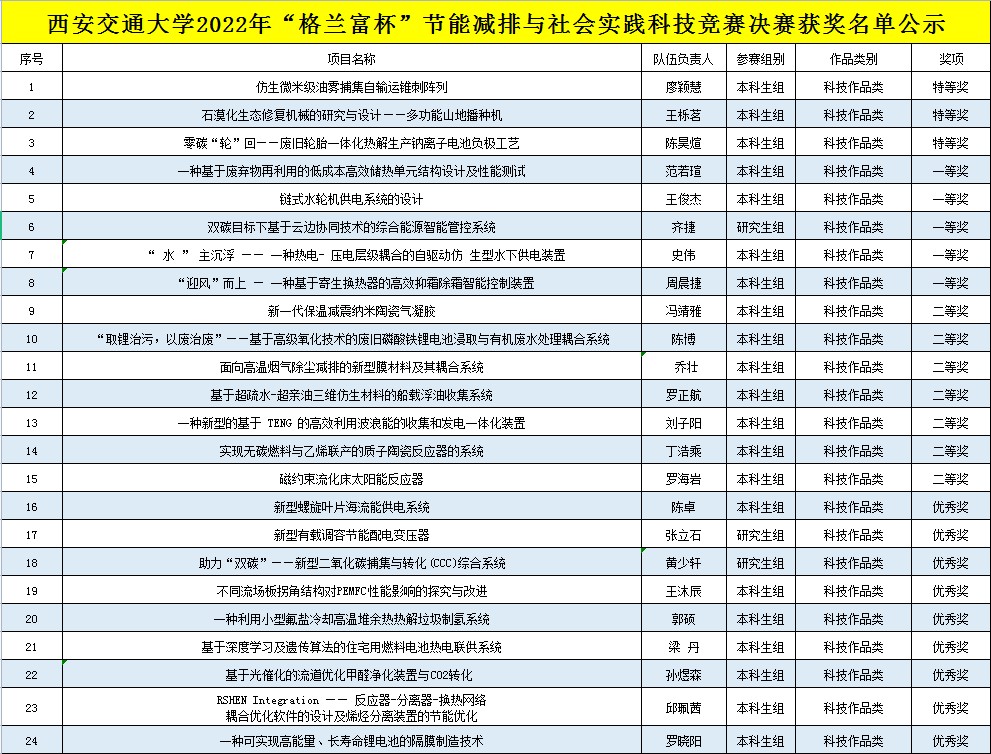 2022年“格兰富杯”节能减排社会实践与科技竞赛开展以来得到校内本科生和研究生的广泛关注和参与,根据作品评分规则,评审专家组对参赛作品进行初审材料评分、终审现场答辩,最终评选出特等奖3项、一等奖5项、二等奖7项、优秀奖9项。现将评审结果公示如下: