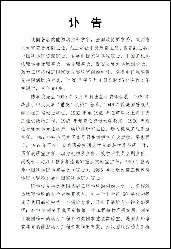 陈学俊是我国热能工程学科的创始人之一、多相流热物理学科的先行者和奠基人。先生于上世纪50年代初筹建了我国高校中第一个锅炉专业,开出了锅炉专业的全部课程;1979年创建了我国高校第一个工程热物理研究所;创建了我国唯一的动力工程多相流国家重点实验室,是国内外享有盛誉的能源动力工程专家和教育家,为我国能源动力工程科学事业做出了杰出贡献。