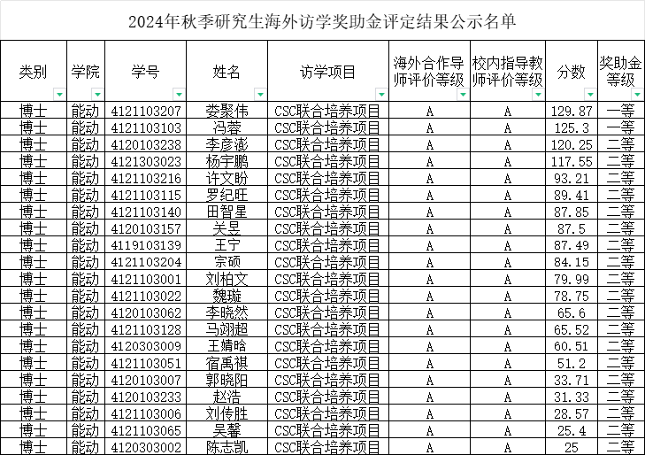 经过个人申请,学院审核,现将2024年秋季学期研究生海外访学奖助金评定结果公示如下: