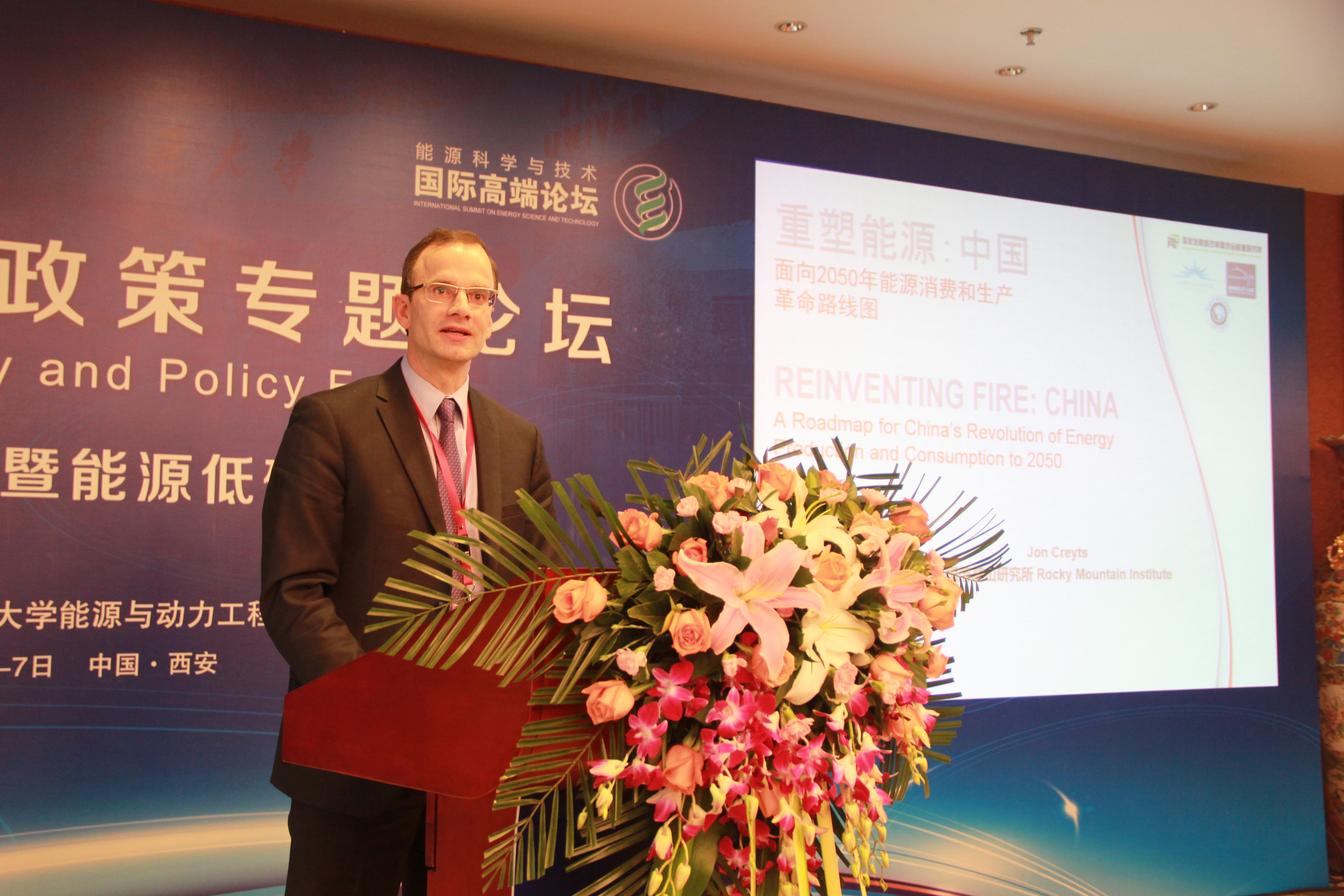 分党委书记王树众教授主持下,几个精彩的主题报告拉开了主题论坛的序幕。中国能源研究会副理事长周大地先生介绍了有关气候变化的2℃问题、全球气候变暖对经济环境、生态环境的影响以及中国能否实现艰巨的节能减排任务,实现从高碳经济到低碳经济的转变至关重要,并指出绿色低碳的发展对于中国而言,不是压力,而是新的发展空间。美国落基山研究所(RMI) 副所长John带来了精彩的重塑能源中国——面向2050年能源消费和生产革命路线图报告,该报告提出在2050年传统化石能源枯竭之前实现向新能源时代全面转型的路线图,并分别为交通、建筑、工业和电力四大能源消耗领域提供了具有可行性的现实解决方案,目标是重塑现有能源体系,彻底摆脱化石燃料的束缚,再造一个不同于人类已经沿用了几百万年的“新火源”。随后清华大学中国碳市场中心主任段茂盛教授作了碳市场的前世今生暨“巴黎协定”后的展望的报告,给大家阐述了为什么需要碳市场、碳市场从哪里来、国际碳市场的改变以及控制温室气体排放的政策工具等。