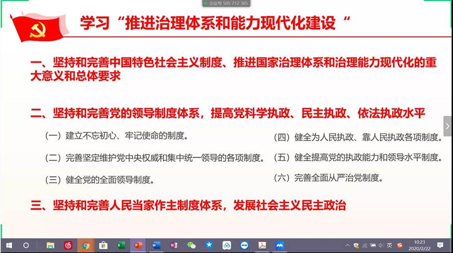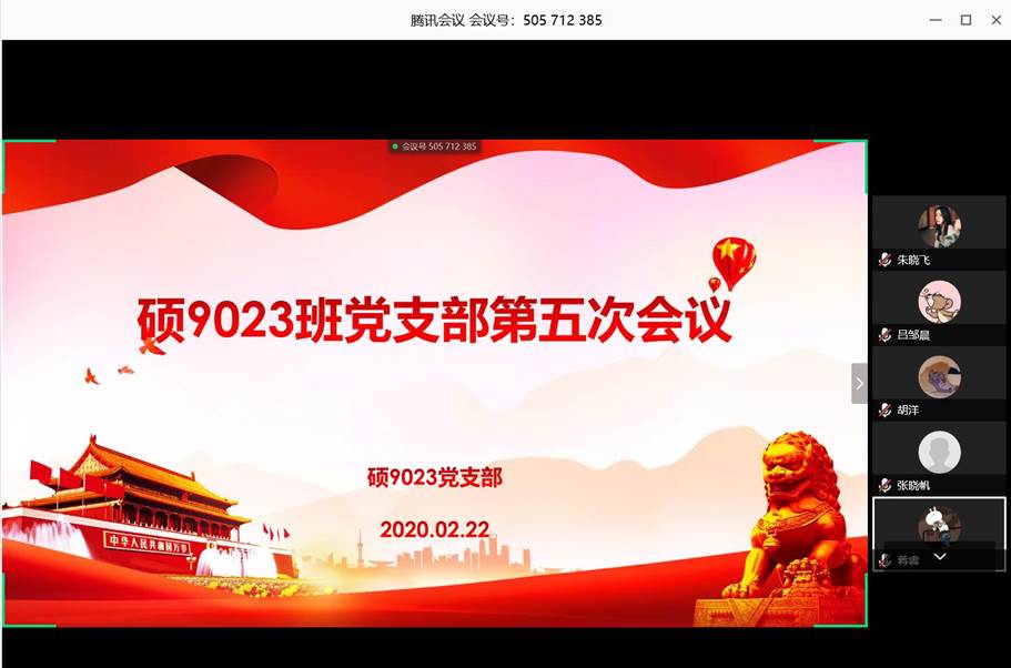 硕9023党支部于2020年2月22日上午举行了第五次支部生活会,由于疫情原因,会议形式为腾讯会议app线上会议,9023支部全体党员、预备党员及入党积极分子参加了会议,会议由党支部书记伏建宁同志主持。开会前大家在腾讯会议中签到。