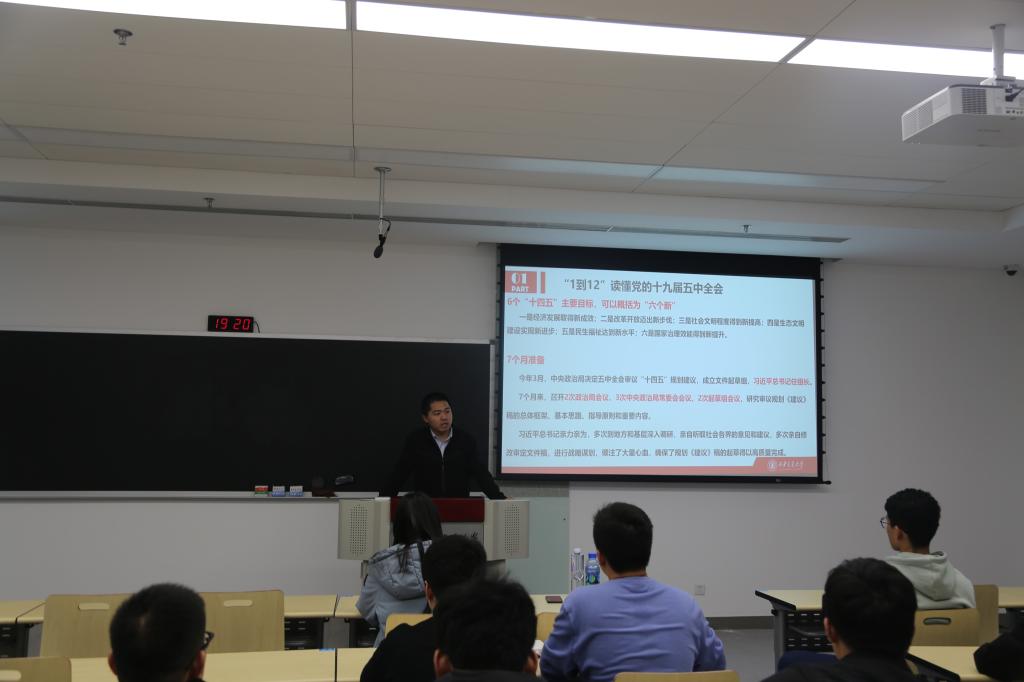 会议主要分为三个部分,倪蒙同志以《从“1到12”读懂党的十九届五中全会》为主题解读十九届五中精神,刘若男同志作《你所不知道的马克思?》主题报告,马道洋同志分享科研学习经验。