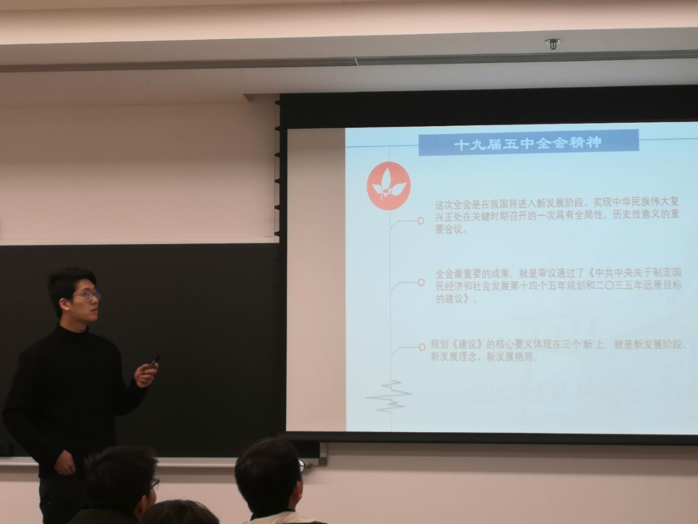 会议由张好雨同志主讲,他根据十八大以来党领导全国人民在各个方面取得的伟大成就引出十九届五中全会是我党在全面建成小康社会收官之际、全面建设社会主义现代化国家新征程即将开启的重要历史时刻召开的一次意义重大的会议。他仔细为大家讲述了会议最重要的成果,即审议通过了《中共中央关于制定国民经济和社会发展第十四个五年规划和二〇三五年远景目标的建议》。
