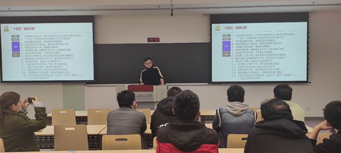 会议第一项,由9028班党支书彭年同学带领大家学习《中共中央关于制定国民经济和社会发展第十四个五年规划和二〇三五年远景目标的建议》。彭年同学首先分析了目前的国内外环境和“十四五”规划编制时间表,让大家对“十四五”规划的重大历史意义有了深刻的认识。接着,彭年重点从“十四五”时期经济社会发展指导方针和主要目标;坚持创新驱动发展,全面塑造发展新优势;加快发展现代产业体系,推动经济体系优化升级三个方面进行解读。同时,彭年从自身实践出发分享了对“内卷、打工人、学历贬值”和“‘十四五’时期政策指引下研究生职业规划”的看法,他认为我们研究生应当摆正心态、提升技能、适应变化,职业规划应往国家需求上靠、服务国家。