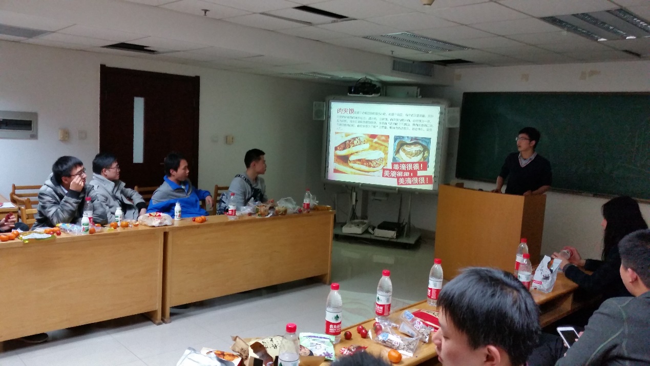 活动开始前,同学们就迫不及待地“瓜分”了各个小组所带来的各地特色小吃。紧接着,各个小组的成员一一登台亮相,为大家详细讲解各个省份的风土人情以及特色小吃。首先是上海组的汪翔宇,他通过一张张精美的PPT以及风趣幽默的讲解让我们重温了大白兔奶糖的奶香四溢,香酥烧饼的酥脆可口以及五香豆的别样风味,也让我们联想到了上海人的温婉细腻以及交通大学老一辈们的温文尔雅。接下来是江苏组登场,通过组长徐琳峰的娓娓道来,我们了解了南京的小笼包,苏州的松子糖,无锡的海棠糕,扬州的炒饭以及常州的三鲜馄饨等一大批特色小吃。虽然他们无法在现场为大家一一展示这些美食实物,但是组员也为大家尽心尽力准备了一些当地的特色零食,这也让在座的每位同学不至于听得饥肠辘辘。第三组是安徽特色,组长侯俊才为了大家的精神食粮也是煞费苦心。不仅准备了安徽的各类特色小吃供大家一一品尝,更值得褒扬的是他也将安徽的历史人文以及民俗风情做了详细的介绍。从草木皆兵的秦晋大战、揭竿而起的大泽乡起义到百步穿杨的楚国神射手养由基和林壑深秀、溪水潺潺的醉翁亭,无不彰显出安徽独特而又充满神奇历史魅力的灿烂文化。闻名中外的黄山奇景、震铄古今的徽剧古韵,更使我们对徽派文化有了全新的认识。交大西迁的下一站到了河南,也许是为了彰显这第一人口大省的独特气质,组员的工作尤其用心良苦,共派出张智慧、刘战胜以及魏征三个人来分别讲解开封、郑州以及洛阳的地域美食以及风土人情。无论是开封的锅贴、灌汤包和炒凉粉还是郑州的羊肉烩面、龙须糕或者鲤鱼三吃抑或洛阳的胡辣汤、水席还是浆面条都让人觉得无比美味,通过他们的讲解也让我们充分领略到了中原人民那丰富的创造力和无与伦比的智慧。最后一组的同学来自于西迁的终点站——陕西。作为关中平原土生土长的当地人,班长潘阳在陕西特色美食方面最有发言权。无论是羊肉泡馍、凉拌饸饹还是肉夹馍、biángbiáng面,都可以从PPT的精良制作以及讲解的生动细致体现出来。