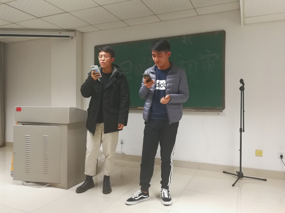 首先展开角逐的是歌唱类节目,徐达和夏斯琪同学的一首《小梦想大梦想》瞬间清空了大家的杂念。徐达同学那悠扬的声线带领着各位从贝加尔的湖畔到微风浮动的金色麦田,从轻泛泡沫的浪花到闪烁星光的夜空。声音之优雅,之空灵令现场各位如痴如醉,再佐以夏思琪同学那稍显厚重的声音,二者相映成趣,共同编织出一首动人的旋律。不仅如此,在陈宁娜主席的要求下,二人迅速,风格一转又将《小酒窝》轻松驾驭。