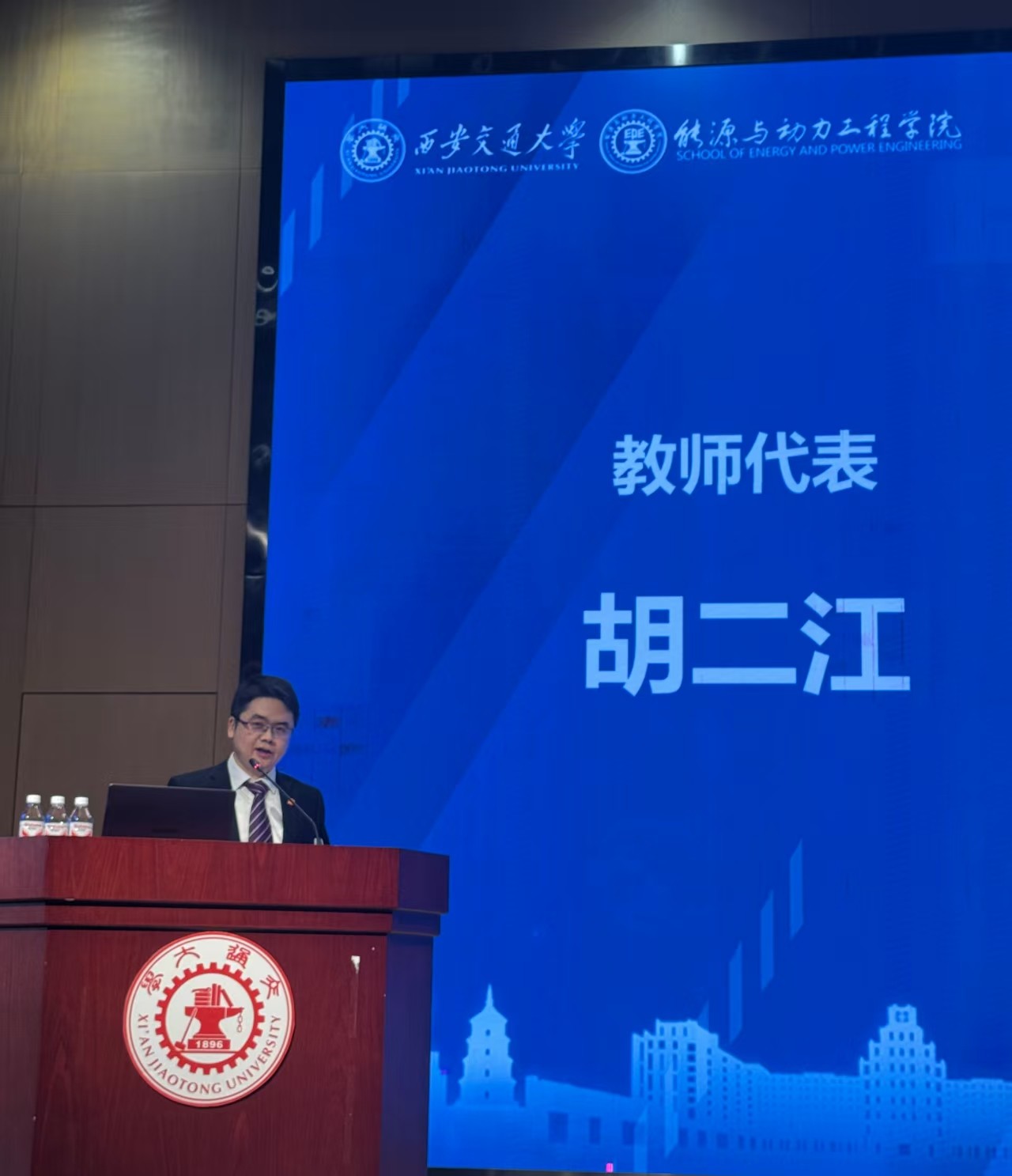 胡二江教授作为教师代表发言。他分享了自己在交大的学习成长经历,面对时代的机遇与挑战,他坚定地选择扎根西部、深耕科研。作为导师,他向同学们提出了三点期待:同学们要立大志,把个人理想融入时代发展;要敢攻坚,以坚韧品格对抗挫折;要勤钻研,用扎实知识筑牢根基。他希望同学们既能做“钻木取火”的坚守者,也能做突破“卡脖子技术”的先行者,用青春和汗水在时代浪中扛起青年的责任担当。
