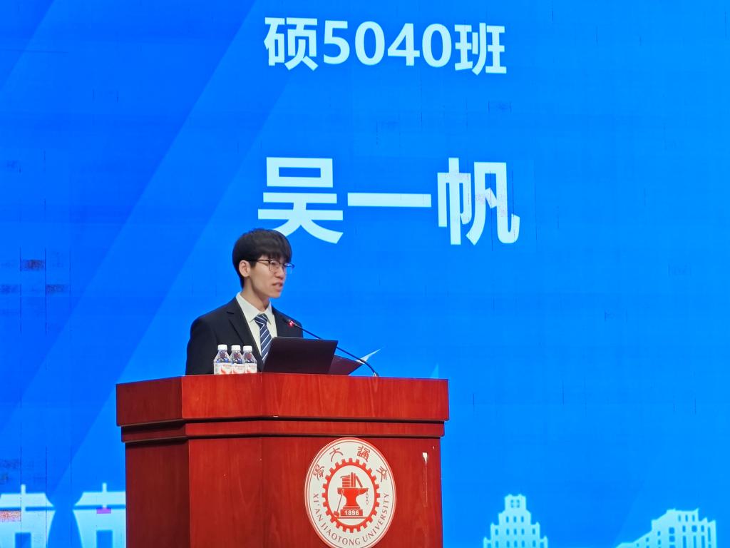 硕5040班吴一帆作为新生代表发言。他回顾了自己在交大的学习科研经历,站在新的起点上,号召同学们要传承弘扬西迁精神,将个人理想融入国家理想;希望未来能够从“学习者”转向“创造者”,脚踏实地、耐住寂寞,勇于面对科研挑战;呼吁同学们深耕专业、锤炼本领,共同服务“双碳”目标,以实际行动践行科技报国使命,让青春在奉献中焕发耀眼光芒。