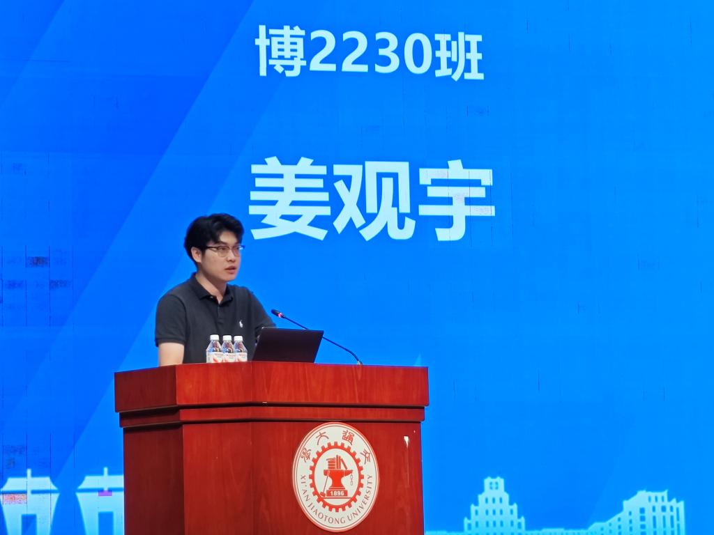 博2230班姜观宇作为老生代表发言。他结合自己的科研心得和成长经历,给新生分享了四点感悟:首先,在研究生阶段要完成思维的转变,从“学会”到“会学”;第二,要保持好奇与热爱,享受探索的旅程;第三,要学会平衡与协作,收获真挚的情谊;第四,要传承交大精神,担当时代使命。他希望师弟师妹们在未来不仅能收获知识、提升能力,更能明确方向、坚定内心,书写属于自己的精彩篇章。