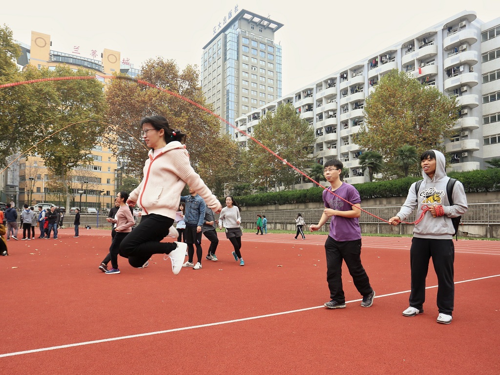 再看团体赛赛场,比赛项目有跳大绳、趣味接力赛、三人四足、踢毽子以及你划我猜。首先由跳大绳拉开团体赛序幕,除去两名摇绳的队员之外,其他的队员依次跳绳,虽然是第一个团体赛项目,但选手们一点都不紧张,一切井然有序的进行着。接着进行了踢毽子比赛,现场十分的热闹。而随着4×100趣味接力赛的开始,比赛达到了高潮,同学们的呐喊助威声此起彼伏,选手们克服一个又一个障碍物将接力棒传入下一个选手手中,那一股冲劲就是青春的力量,彰显了年轻人该有的风采。在你划我猜赛场上,场面相当有趣,选手们放下了偶像包袱,使出全身力气比划着,只为向队友传递正确的信息。最后进行的是三人四足,这个项目最考验选手之间的配合,这一刻,所有的队员仿佛连着一颗心,伴随着“一二,一二”的口号向着终点冲去,体现了团结的力量。无论踢毽子、你划我猜、跳大绳,还是三人四足,都考验着队员们的默契,两旁的加油声不断,赛场气氛十分活跃。