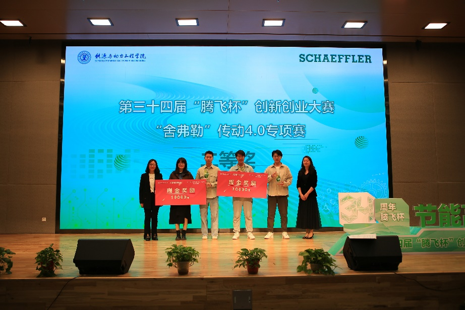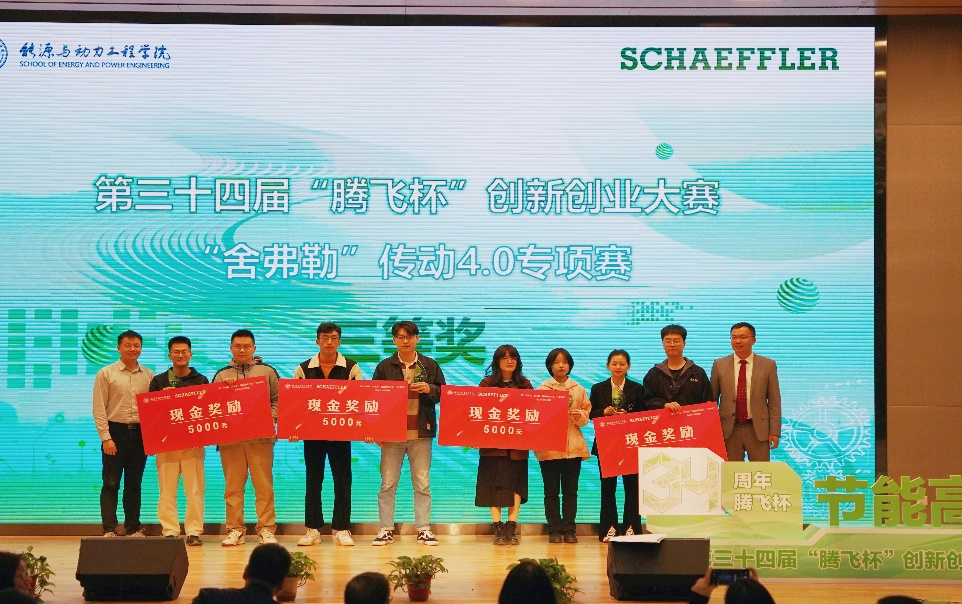 为让西交学子更好地了解行业发展趋势和需求,现场设置优秀获奖队伍展示交流。各参赛队伍基于不同角度,从工艺流程优化,生态环保以及医疗健康等方面阐述了相同愿景:助力节能减排,共创绿色家园!汇报结束后,参会嘉宾为第三十四届“腾飞杯”创新创业大赛“舍弗勒”传动4.0专项赛获奖队伍颁奖。