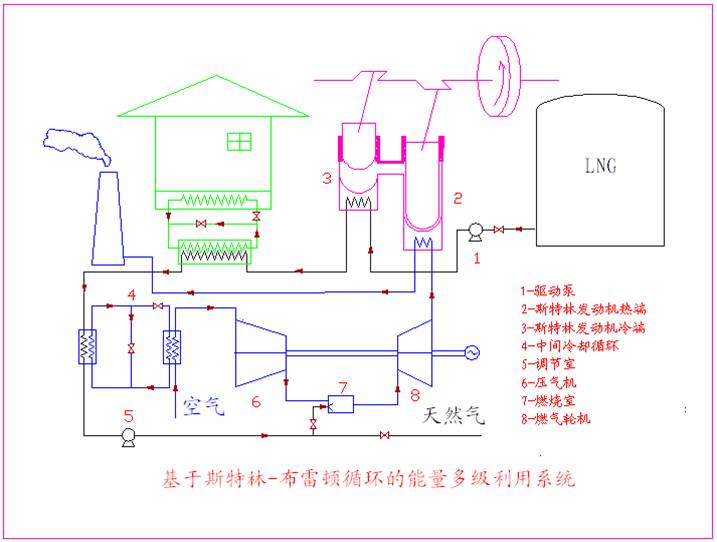 本作品方案基于斯特林—布雷顿循环,设计了一套梯级利用LNG(液化天然气)冷能和燃气轮机排气余热的系统。系统中LNG流经斯特林机的冷端、冷库、燃气轮机进口空气冷却装置,吸收热量气化为NG(天然气)。燃气轮机产生的排气流经斯特林机的热端,放出热量,降低温度后经烟囱排入大气。斯特林机在两端温差的作用下启动,对外做功。在本方案中,LNG的气化吸热考虑了冷能的品位,高品位的冷能用来做功,低品位的冷能用来制冷。而且由于斯特林机的冷端温度较低,燃气轮机的排气余热可以得到最大程度的利用。当燃料采用较为清洁的LNG气化产生的天然气并采用耐腐蚀的材料作为传热元件,排气温度可以做到在现有基础上进一步降低。