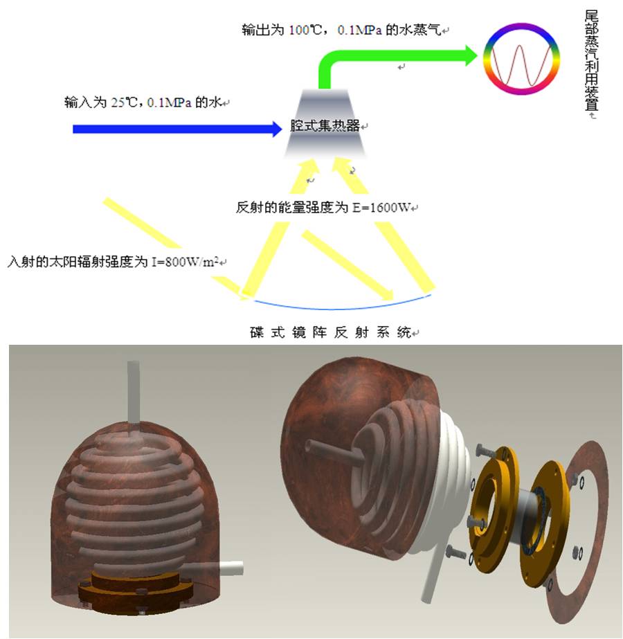 虽然国内光热发电技术较为落后,但民用太阳能开发还是十分红火的,如太阳能热水器、太阳灶的开发等,但是对于利用太阳能去产生低参数蒸汽,以减少化石燃料的消耗以及削减CO2的排放在国内仍旧是空白。本作品由3个部分组成,反射镜、集热器、蒸汽利用部分。反射镜为一聚光比约为350至450的凹面镜。腔体形状类似于一个倒扣的碗,聚焦后的日光从下方射入腔体,加热从底部进入的水,蒸汽从顶部出来。初始参数为常温常压下的水进入腔体式换热器,流经换热器内的吸热壁,吸收太阳辐射热量而转化为蒸汽。蒸汽再进入发电设备或其他利用设备。