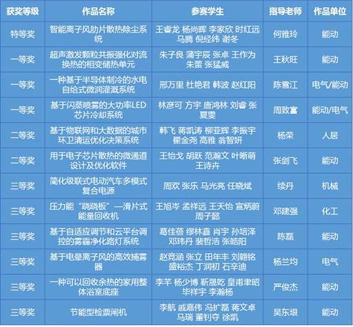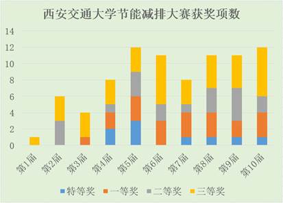 2017年8月,在第十届节能减排社会实践与科技竞赛决赛中,我校共获得特等奖1项、一等奖3项、二等奖2项、三等奖6项,共12项。