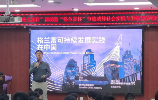 格兰富集团学院经理吴剑对于交大学子在竞赛中取得的成绩表达了充分的认可,作为赛事连续11年的战略合作伙伴,希望在未来能够进一步深化合作。随后,吴剑做主题为《格兰富可持续发展实践在中国》的报告,介绍了格兰富集团的理念、现状及发展规划,强调格兰富致力于可持续发展,在气候行动、水资源行动等方面做出努力。