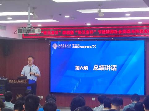 最后,教务处副处长杨建科作总结讲话。首先,他感谢了格兰富集团对司机社 节能减排赛事的大力支持,肯定十一年合作办赛的成果。此外,他介绍了学校在人才培养、产教融合等方面的举措以及取得的成绩,表示在未来将积极落实“6351”“1121”工程,提升校企融合、协同育人成效。最后预祝本届参赛选手在决赛中能够取得优异成绩。