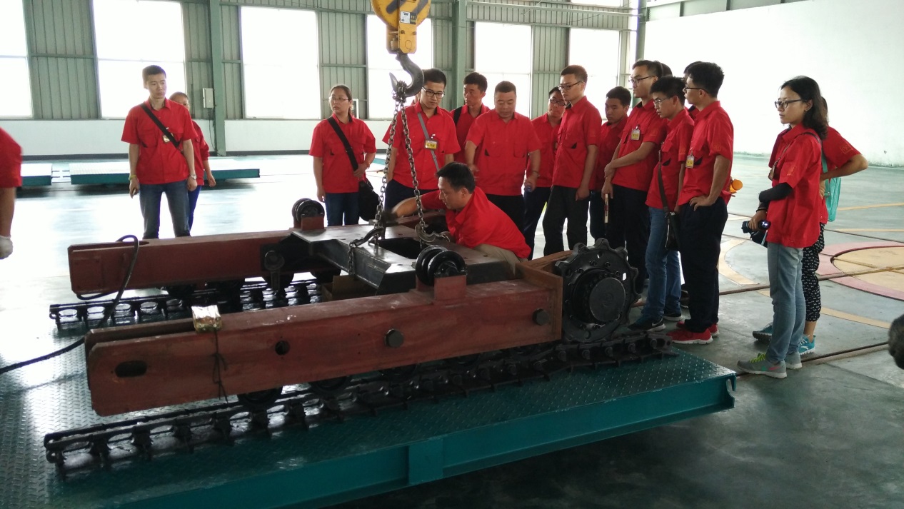 暑期实践团赴掘进机厂区参观新产品生产线。红五环集团于2014年年底斥巨资买下这座旧工厂,并用大半年时间对工厂进行重新设计,将其改造成集工作和休息室于一体的现代化大型工厂。置办了现代化加工设备,并对机械设备进行加工组装,最终实现不同型号掘进机的生产,可用于矿山隧道等开采。苏总告诫同学们,不能立足于现状,而要有开拓进取的意识,如何利用别人不要的,看似无用的资源实现合理的改造和利用,也是成功道路上不可缺少的一环。