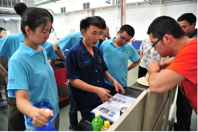 严谨又不失亲切的态度。在看到严密的以4s为间隔的生产线不断作业,同时为了检测生产结果故意抽调并且硬性破坏产品,我们认识到,作为一个全球第一大的压缩机生产厂家立厂之本的严谨态度。同时,为了能够让我们更好的了解他们,不但让为我们解答不同的疑问,更每每将流水线上的产品拿下来让我们进行拆解分析。在机械式的生产线旁对我们亲切的解答,这种强烈的反差更体现出了华意的人性化。