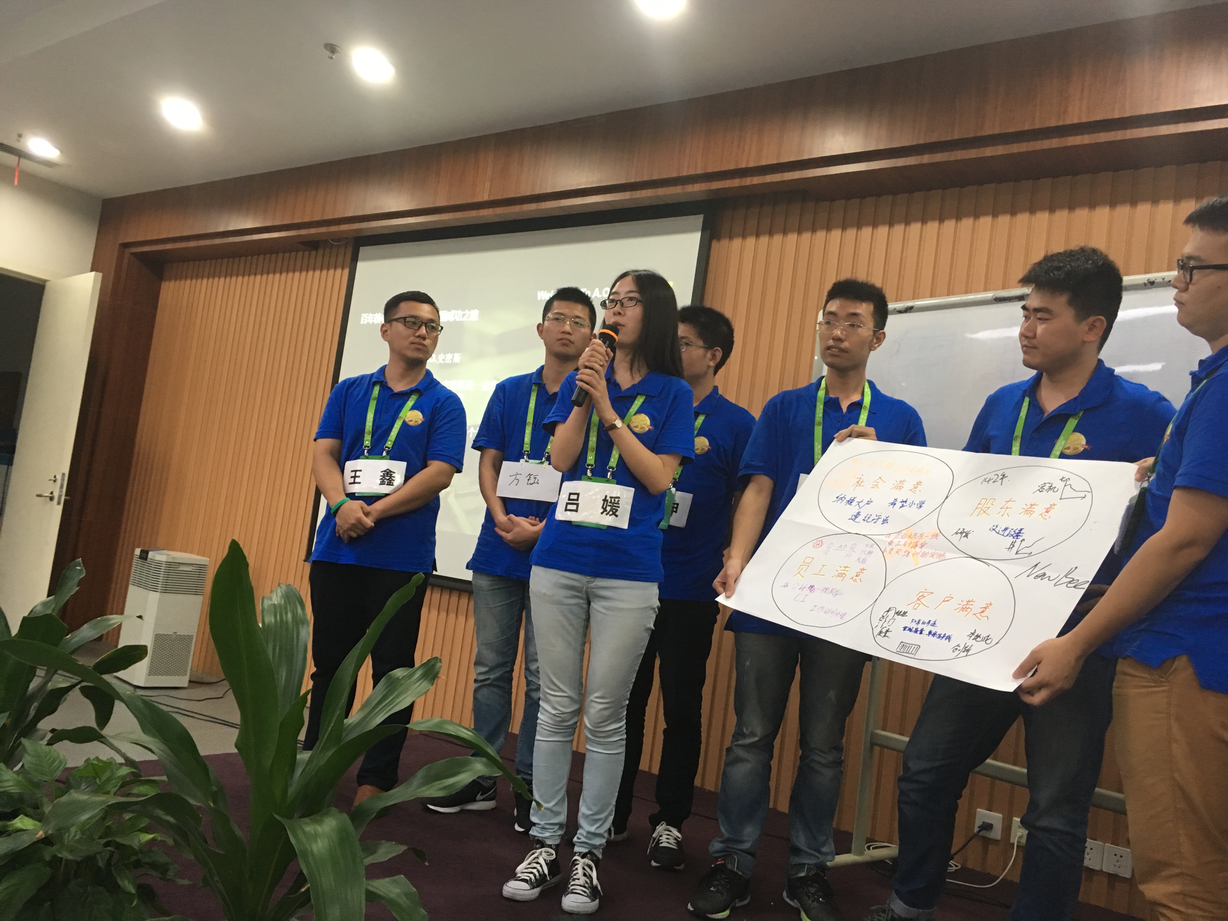 每天清晨在班车上的40分钟就是我们的最后的补觉时间,一旦踏入史密斯公司,我们就会用饱满的精神状态来拥抱公司为我们准备的活动。今天早上等待我们的就是以“百年核心价值观,筑就中国成功之路”为主题的读书分享会。通过这几天的时间对《史密斯成功密码——A.O.史密斯公司的价值观管理》这本书进行研读,每个生活小组通过海报汇报的形式,表达自己眼中的史密斯是一家怎样的公司,并且对公司中出现的不符合价值观的事例进行描述,我们亲切的称之为“找茬大会”。每个小组通过文字或图画来上台展示自己对史密斯公司的印象及看法,并通过具体的事例进行阐述。台下不仅有我们的同学还有人力资源经理对我们的表达能力及团队合作能力等进行考察,为最后对我们的综合评价提供依据。
