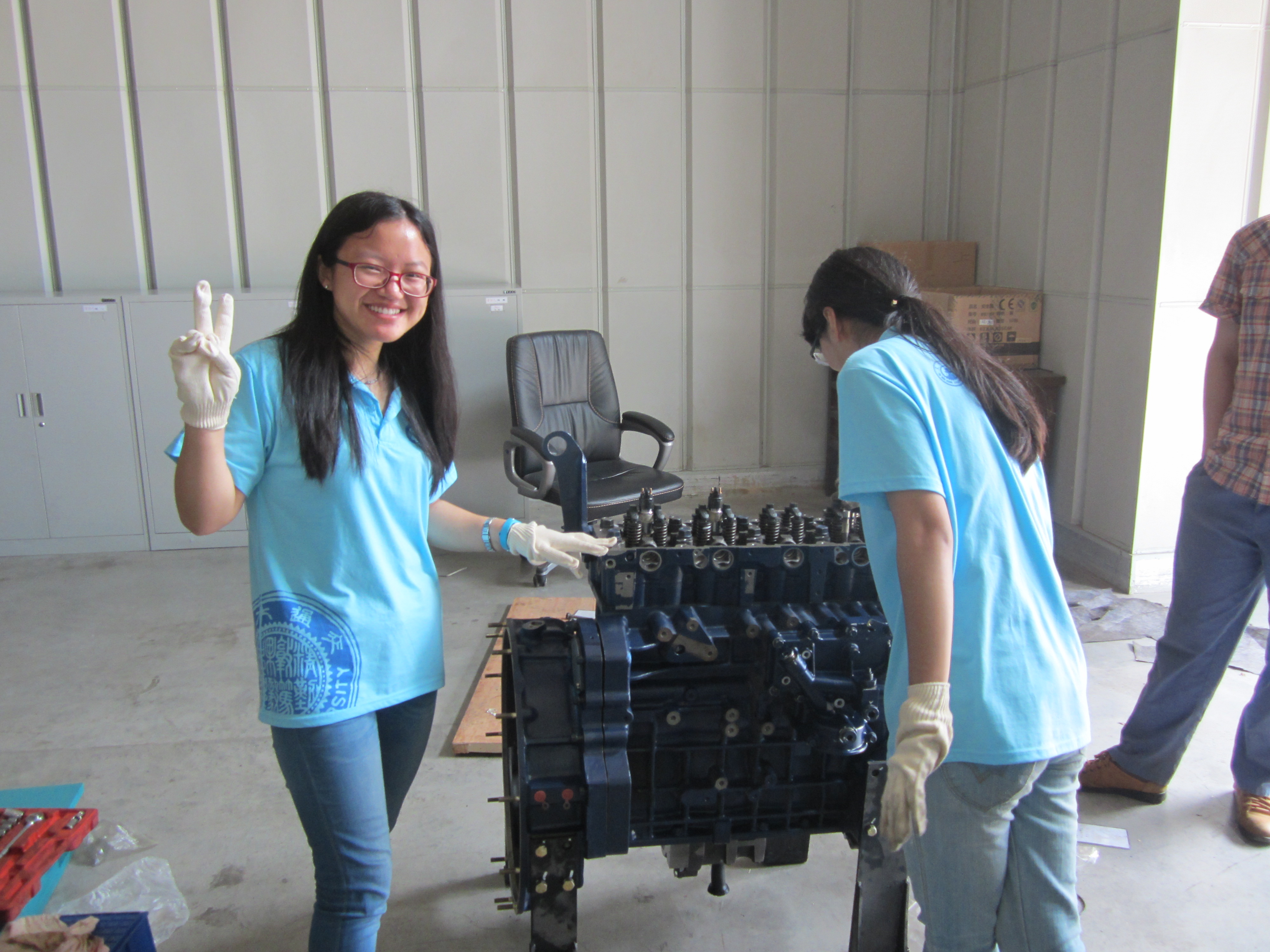 纸上得来终觉浅,绝知此事要躬行。为了使同学们进一步了解一拖集团生产的柴油机及其内部构造和安装工艺,当天下午,团队成员在发动机实验室冯毅班长的带领下,亲身体验了柴油机整机的组装过程。同学们戴上手套,拿起工具,一颗一颗地将螺钉上紧,将曲轴摆正。队中女同学更是巾帼不让须眉,在冯班长与郭赛师兄的指导下,主动承担起关键部件的安装工作。经过一个下午的辛勤劳动,一台中等功率柴油机终于初见轮廓。