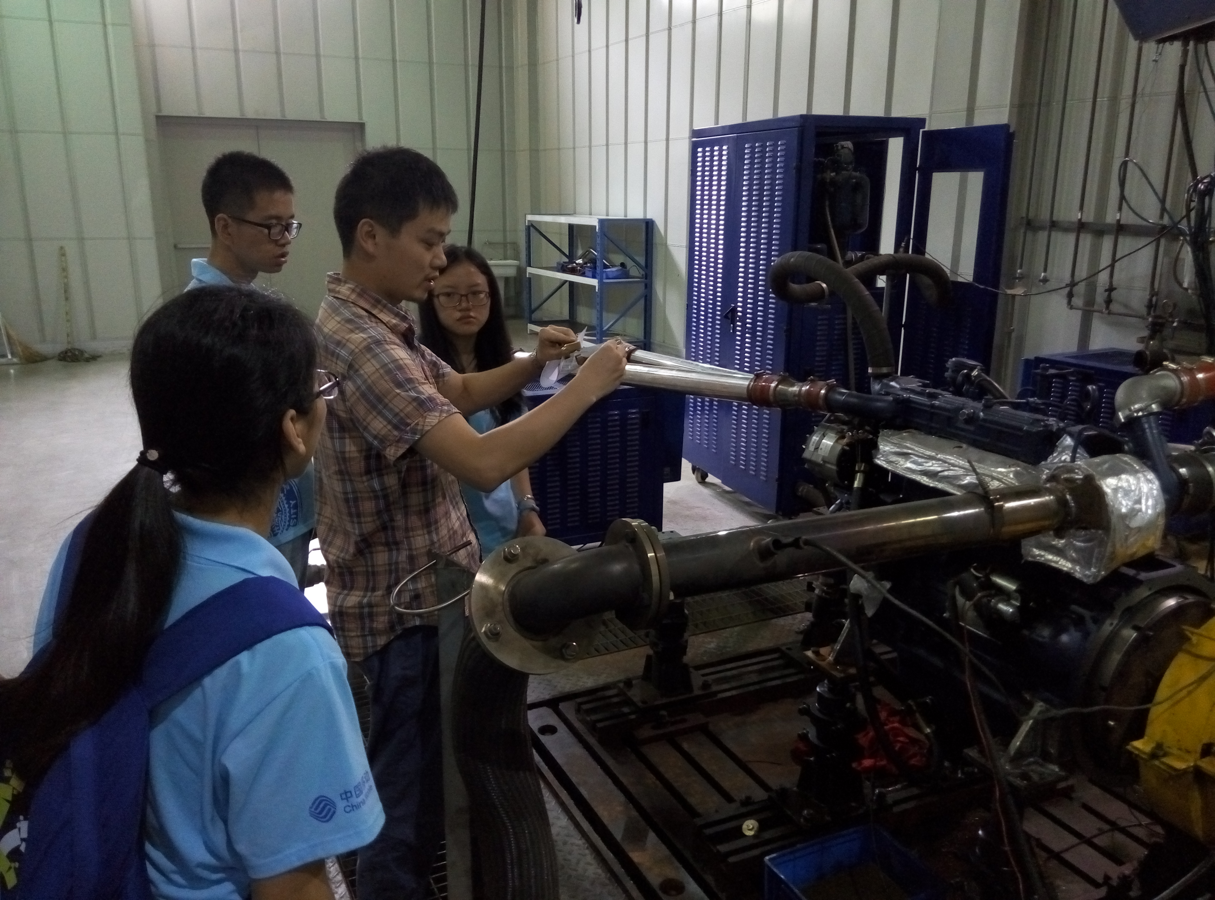 随后,队员们在实验室助理工程师,同样也是交大校友郭赛师兄的带领下,对发动机性能、排放以及噪声测试试验台进行了参观学习。一拖技术中心先进的实验设备及测试手段令同学们叹为观止。